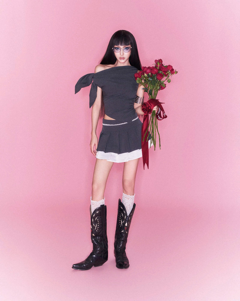 Grey ribbed one-shoulder top with an asymmetric neckline and body-hugging fit, designed to accentuate the waist and create a modern Y2K streetwear silhouette.